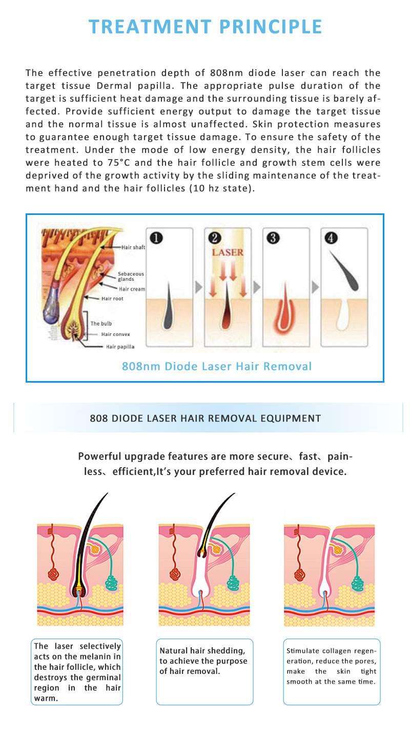 808 nm bangos ilgio lazeris giliai įsiskverbia į odą ir gali būti efektyviai absorbuojamas plauko folikulo, o tai sukelia šiluminę žalą ir efektyviaiPlaukų šalinimas.