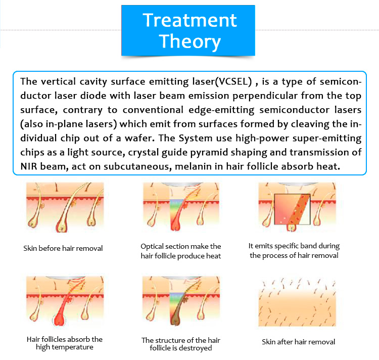 Vertikalaus ertmės paviršiaus spinduliuojantis lazeris arba VCSEL yra puslaidininkinio lazerinio diodo tipas, kurio lazerio spindulys spinduliuojamas statmenai nuo viršutinio paviršiaus, priešingai nei įprasti kraštą spinduliuojantys puslaidininkiniai lazeriai (taip pat plokštuminiai lazeriai), kurie spinduliuoja iš paviršių, susidarančių suskaidžius atskiras lustas iš plokštelės.Sistema naudoja didelės galios itin spinduliuojančius lustus kaip šviesos šaltinį, krištolo kreipiančiosios piramidės formavimą ir NIR spindulio perdavimą, veikia poodį, plauko folikuluose esantis melaninas sugeria šilumą.