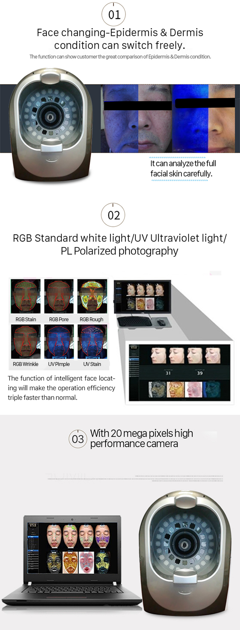 Naujausia atnaujinta veido odos testo versija, HONKON odos analizatoriaus sistema veikia šešiomis RGB/UV/PL/raudonos/rudos/tamsiosios dėmės (RBD) spektrinėmis analizėmis, kad tiksliai analizuotų poras, riebalus, raukšles, pigmentaciją, patikrintų drėgmę ir elastingumą. .