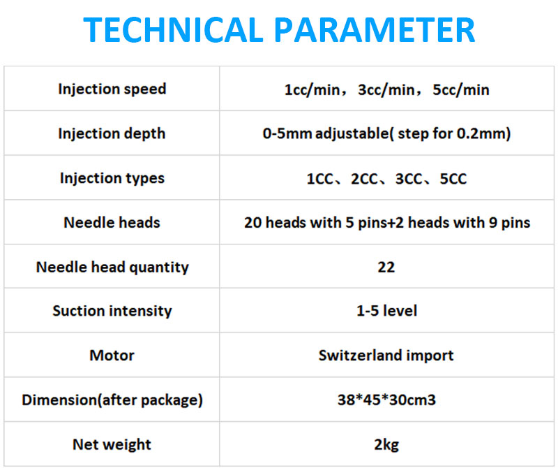 priveržkite ir tada adata įeikite į tikslų odos gylį su mityba.Reguliuojamas įpurškimo gylis, greitis, dozė ir vakuumo intensyvumas.